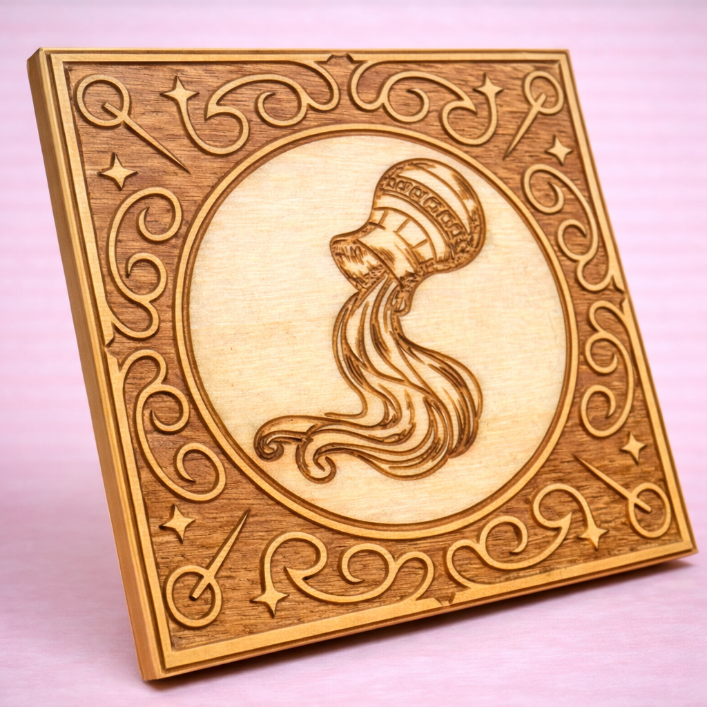 Originální dřevěná dekorace s motivem znamení Vodnáře , symbolu svobody, intuice a pokroku. Každý kus je precizně gravírovaný do topolového dřeva o rozměrech 8,6 × 8,3 cm , ručně ošetřený lněným bio olejem a zakonzervovaný vrstvou pravého včelího vosku , který chrání dřevo před vlhkostí a podtrhuje jeho přirozený lesk. Dekorace může sloužit jako osobní talisman , duchovní symbol nebo stylový podtácek – vosková úprava zaručuje, že dřevo nenanasákne vodu. Každý kus nese otisk ruční práce a autentickou energii přírodního materiálu.