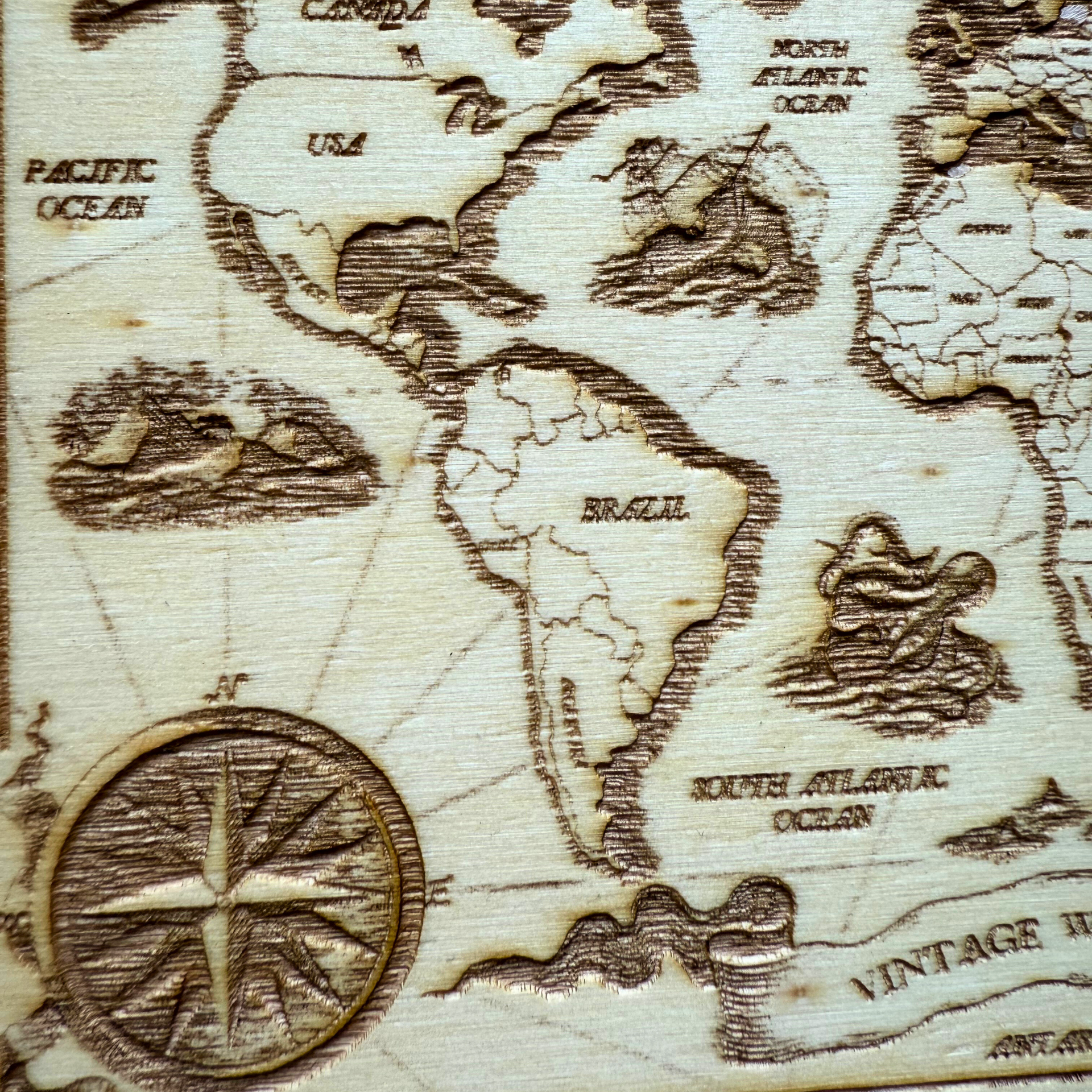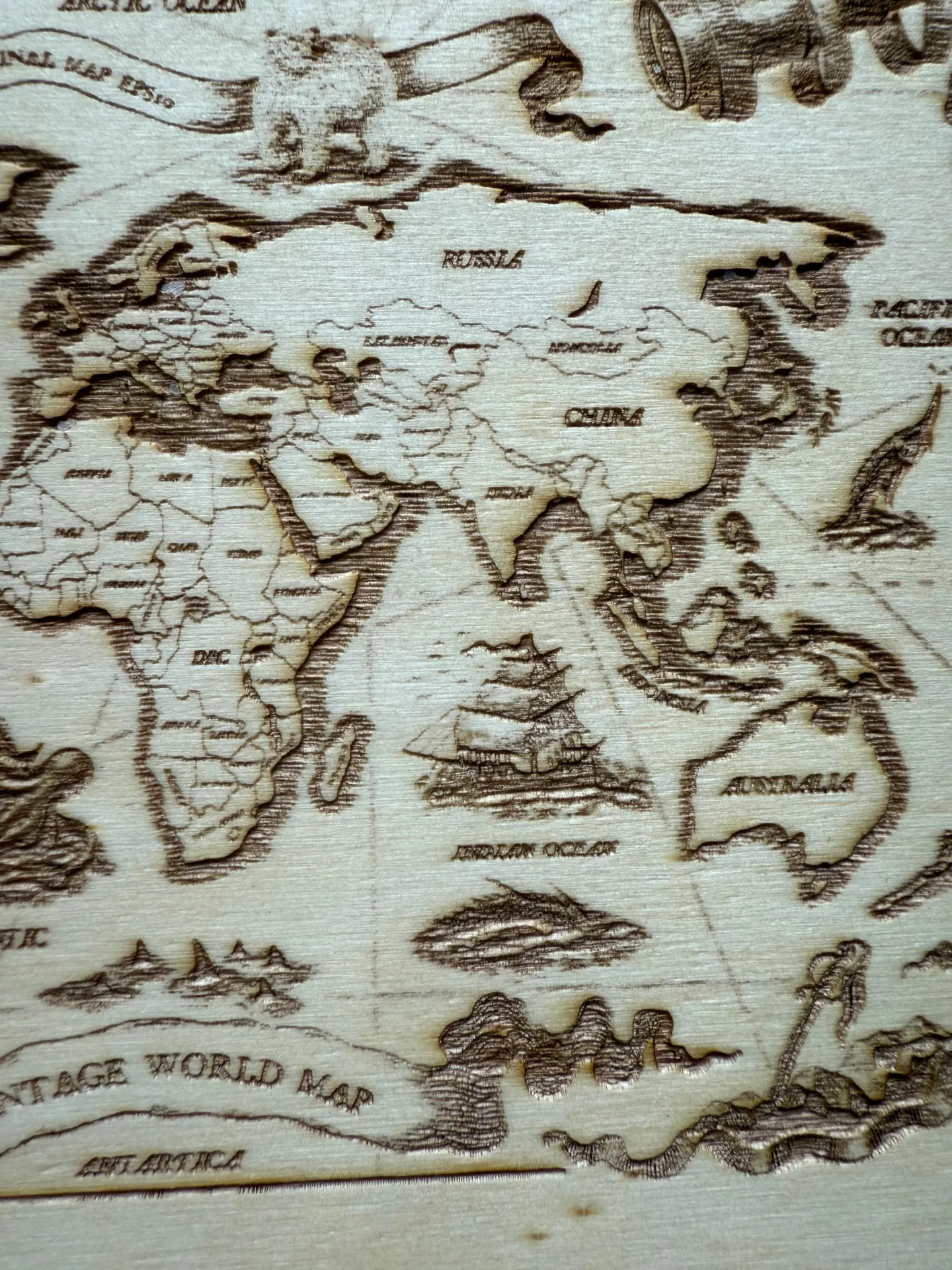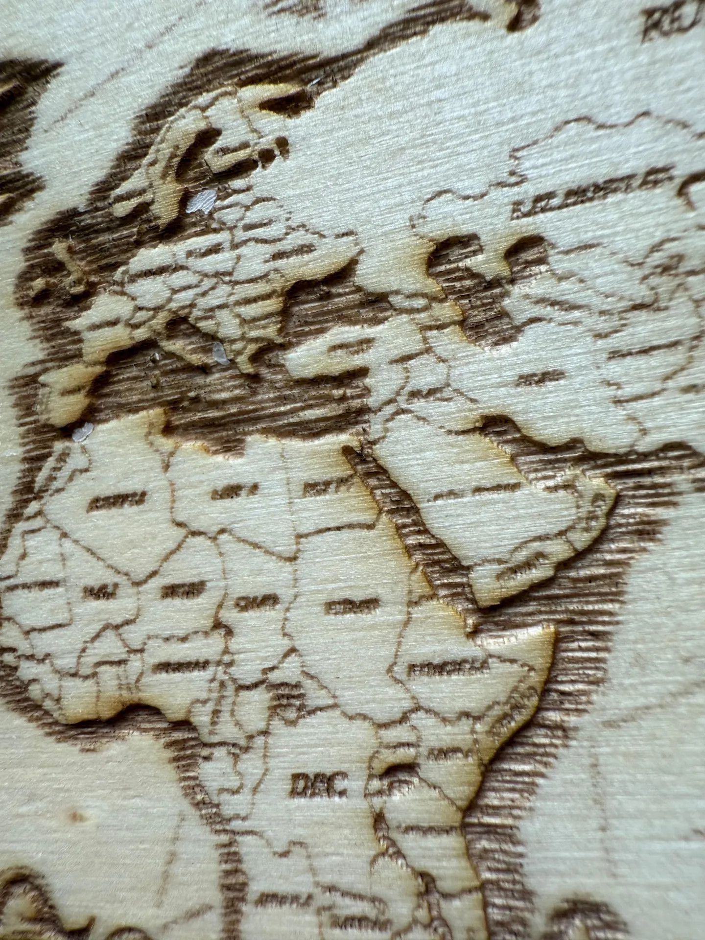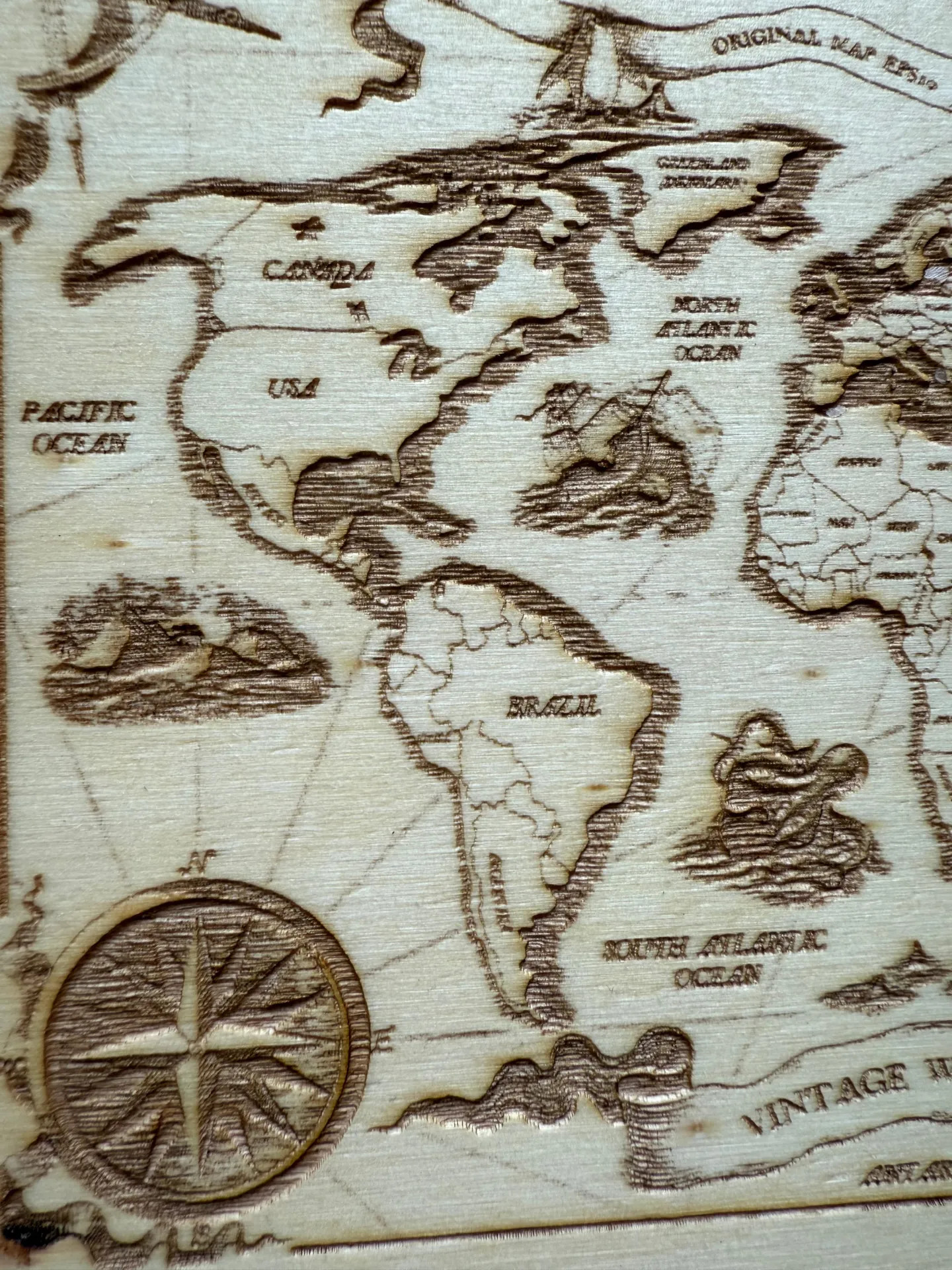 Dřevěná gravírovaná mapa světa Kompas osudu je symbolem objevování, odvahy a vnitřního vedení. Každý detail této dřevěné mapy je precizně vypálen do topolové destičky o rozměrech 19,7 × 19,7 cm, ošetřené lněným bio olejem a chráněné vrstvou včelího vosku.