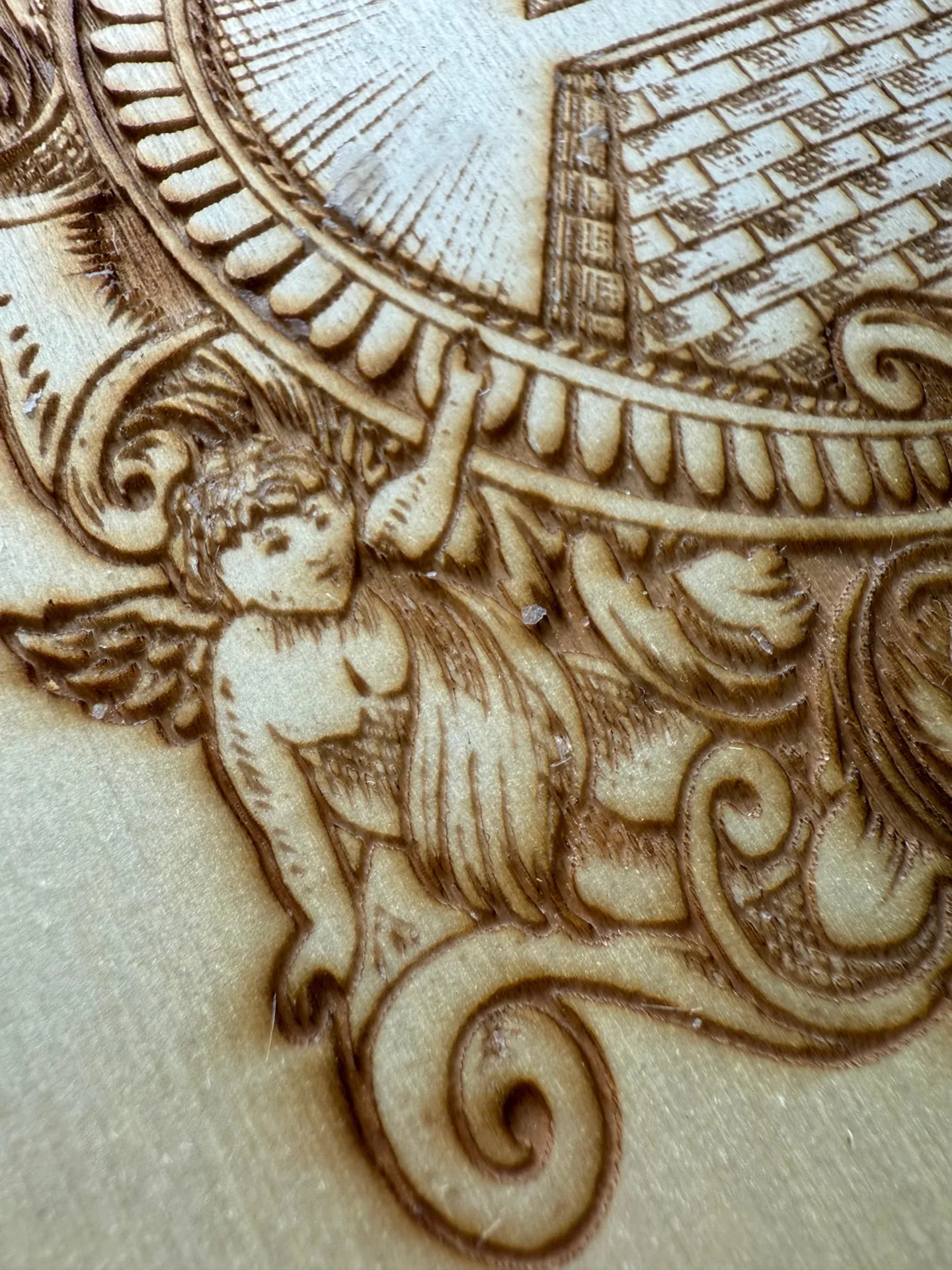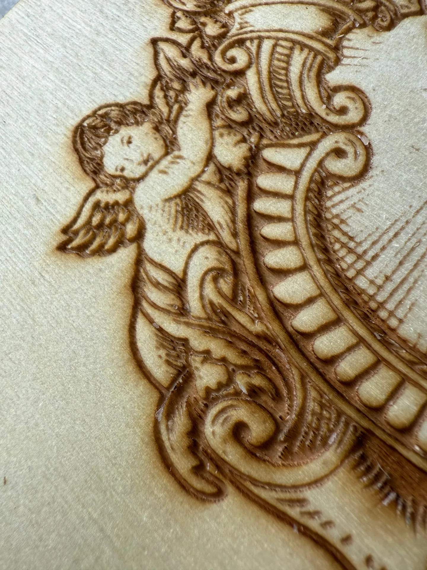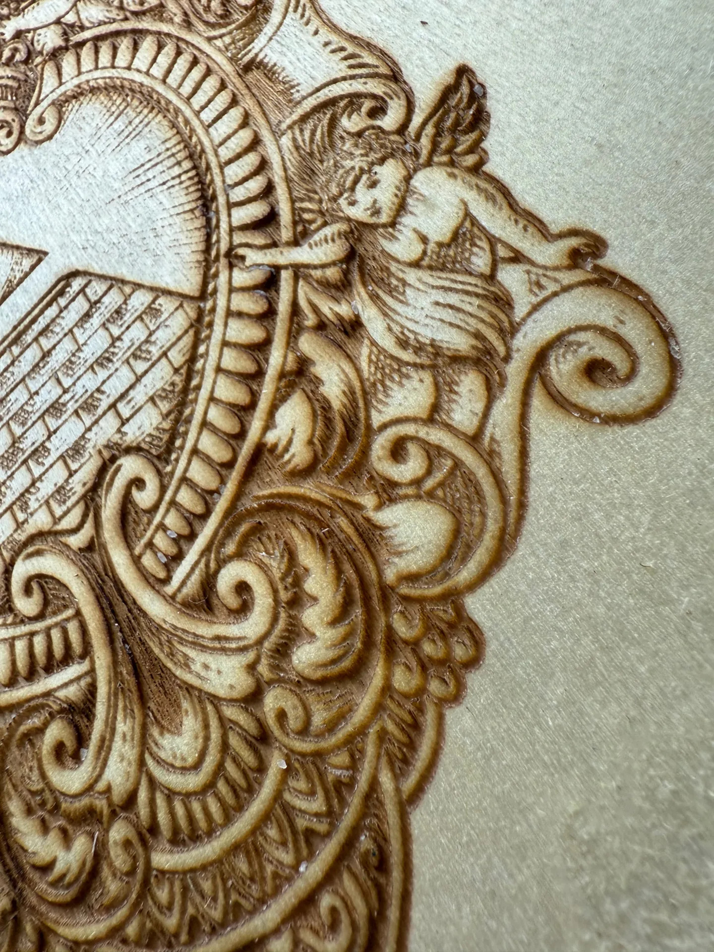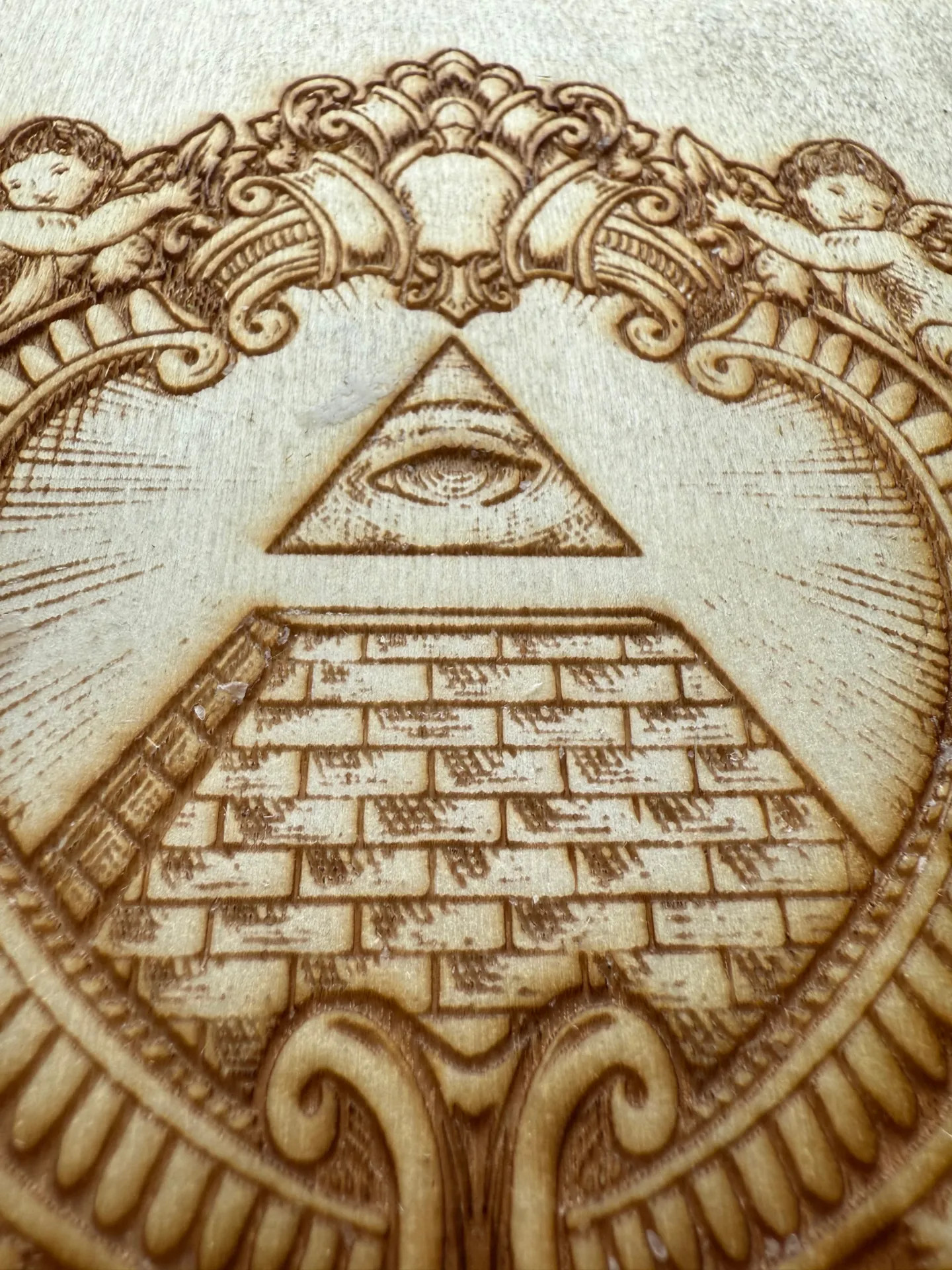 Každý detail reliéfu je pečlivě vypálen laserovou technikou, která zachovává jemné linie i hloubku dřeva. Motiv propojuje archandělskou symboliku s mystickým prvkem zjevení — pohled, který bdí, chrání a připomíná duchovní bdělost.